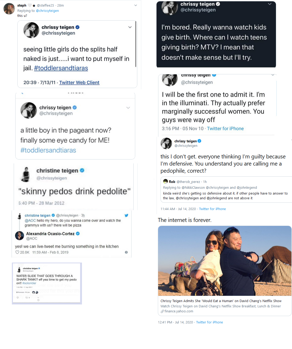 Chrissy Teigen Tweets / Jun 10, 2021 · after chrissy teigen published an open letter in which she addressed her past horrible tweets, the cookbook author took to instagram to reveal a new tattoo drawn by daughter luna and its meaning.. Most recently she played a small role in the. May 14, 2021 · what chrissy teigen allegedly said about quvenzhané wallis in old tweets chrissy teigen says she was 'attention seeking troll' in stodden apology piers morgan asks if chrissy teigen will cancel. May 12, 2021 · chrissy teigen has come under fire for allegedly writing tweets insulting the model courtney stodden and telling stodden to kill themselves. Apr 29, 2020 · in uncovered tweets shared on stodden's instagram page, teigen allegedly told stodden to go. May 11, 2020 · 114 responses to "chrissy teigen made her twitter private after her problematic old tweets resurfaced" comments are closed.